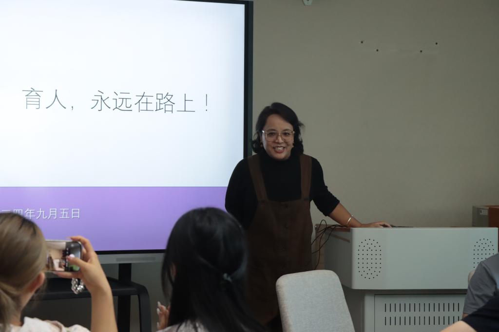 苏丽娜院长代表学院向获得荣誉表彰以及兢兢业业奋斗在教师一线的各位老师们表达节日祝贺和衷心感谢。希望所有老师们把握时代脉搏、拓展视野格局、坚持立身以正,认真思考新时代新命题,坚持“心有大我、至诚报国”的理想信念,深化对“强国建设、教育何为”时代课题的认识和把握,为党育人、为国育才,全面提升教育发展能力,在一体统筹推进教育强国、科技强国、人才强国建设中发挥重要作用。