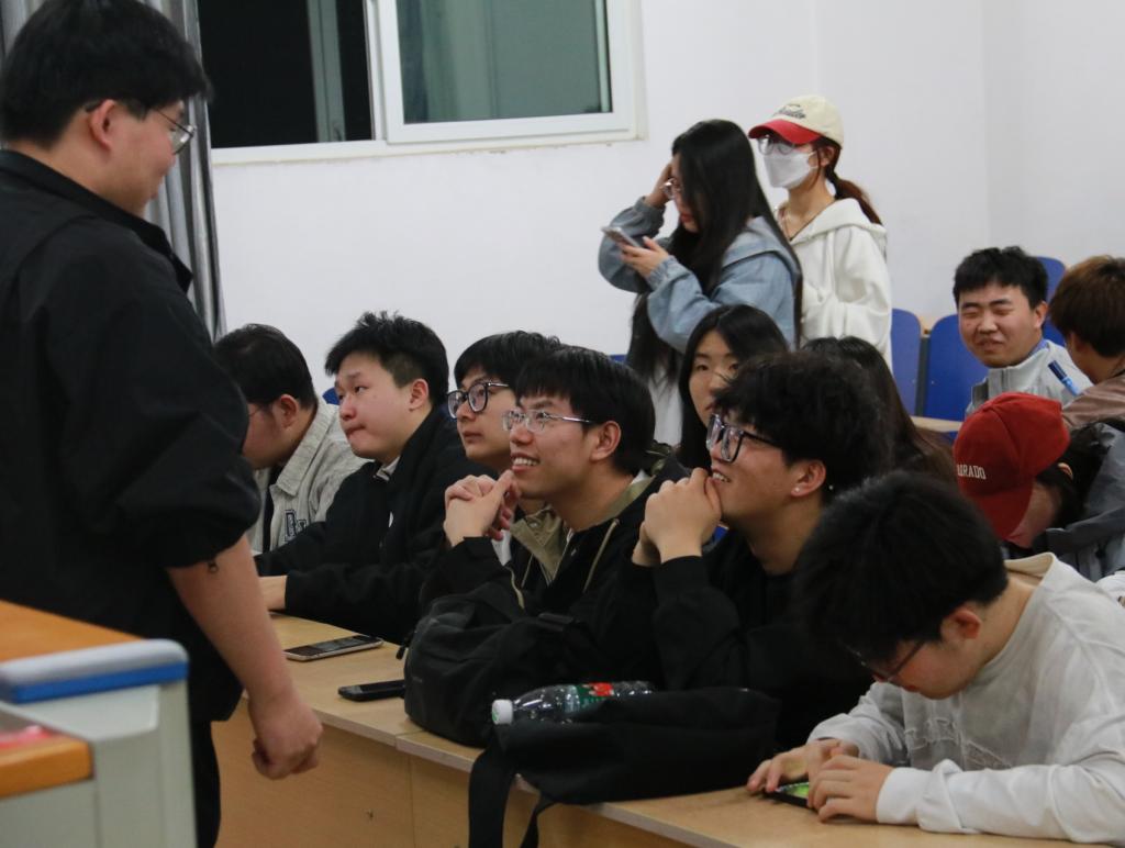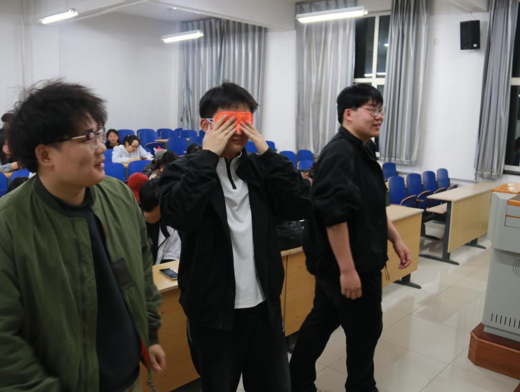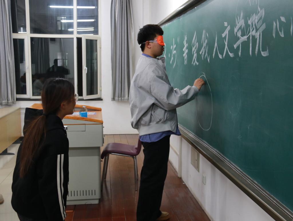 活动包括“击鼓传花:当心跳邂逅绕口令”、“盲画笑脸:默契考验中的心灵对话”、“心灵启迪:在互动中播种阳光”等趣味互动节目。“击鼓传花”,两支记号笔在同学们手中飞速传递。“停!”,敲击黑板的声音骤然停止,拿到记号笔的两个同学登上讲台,选取绕口令进行挑战。“盲画笑脸”,每队两人需分工协作,一人蒙眼执笔,另一人通过语言引导同伴在黑板随机圆圈内完成笑脸创作;“心灵启迪”通过破冰游戏等形式帮助同学们突破社交壁垒。