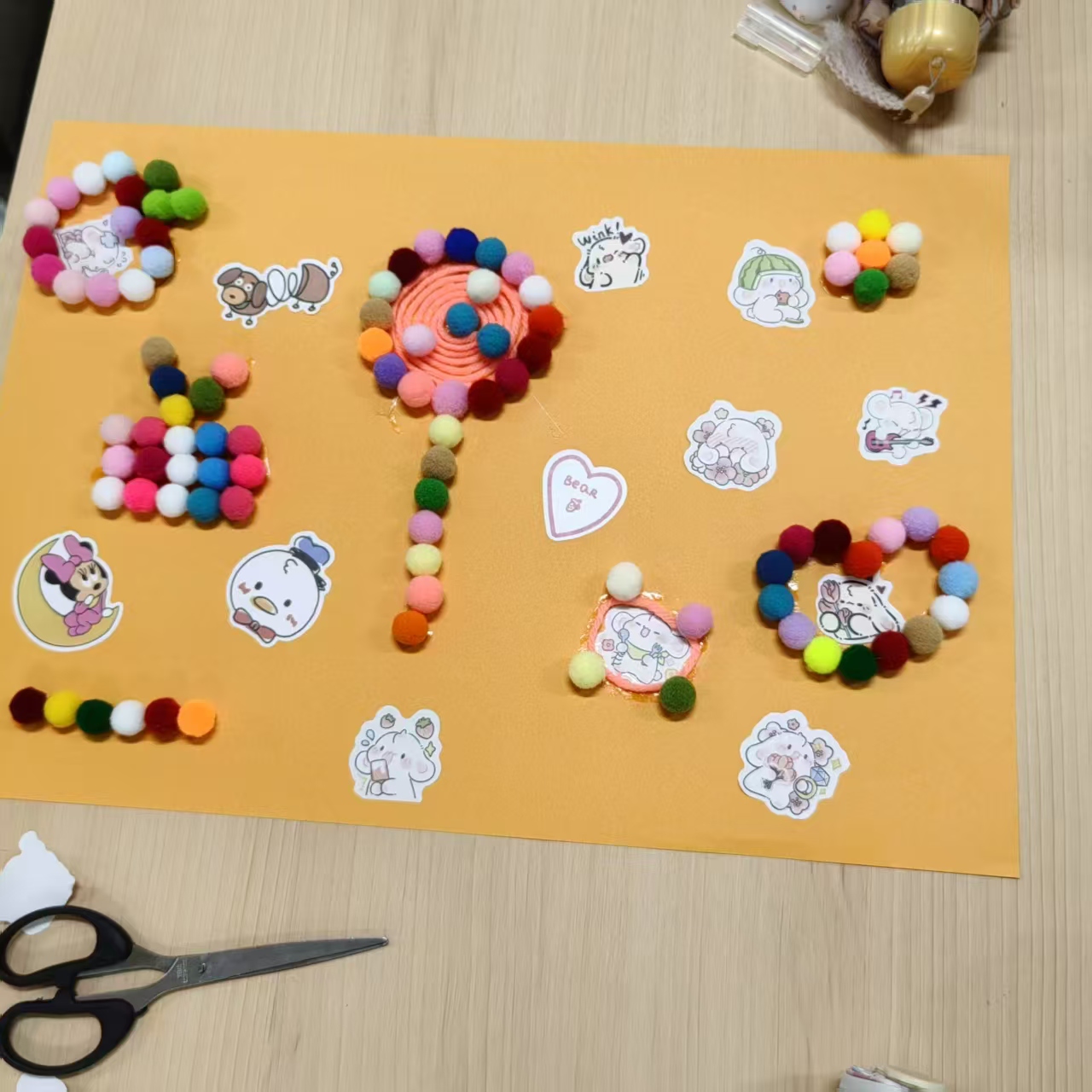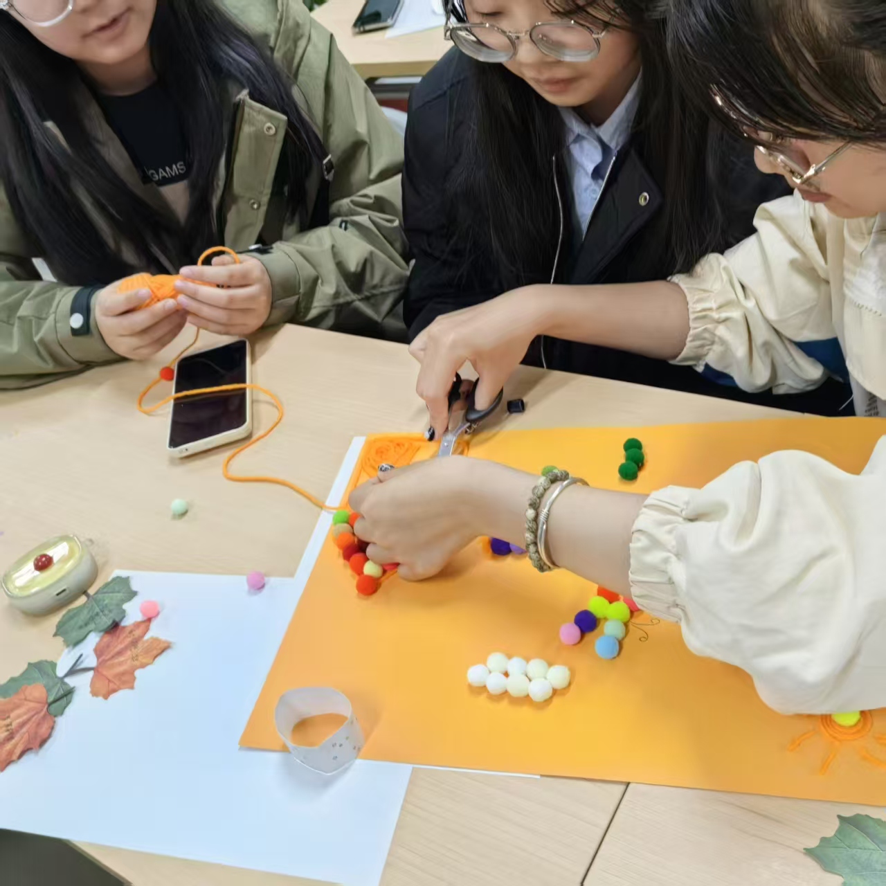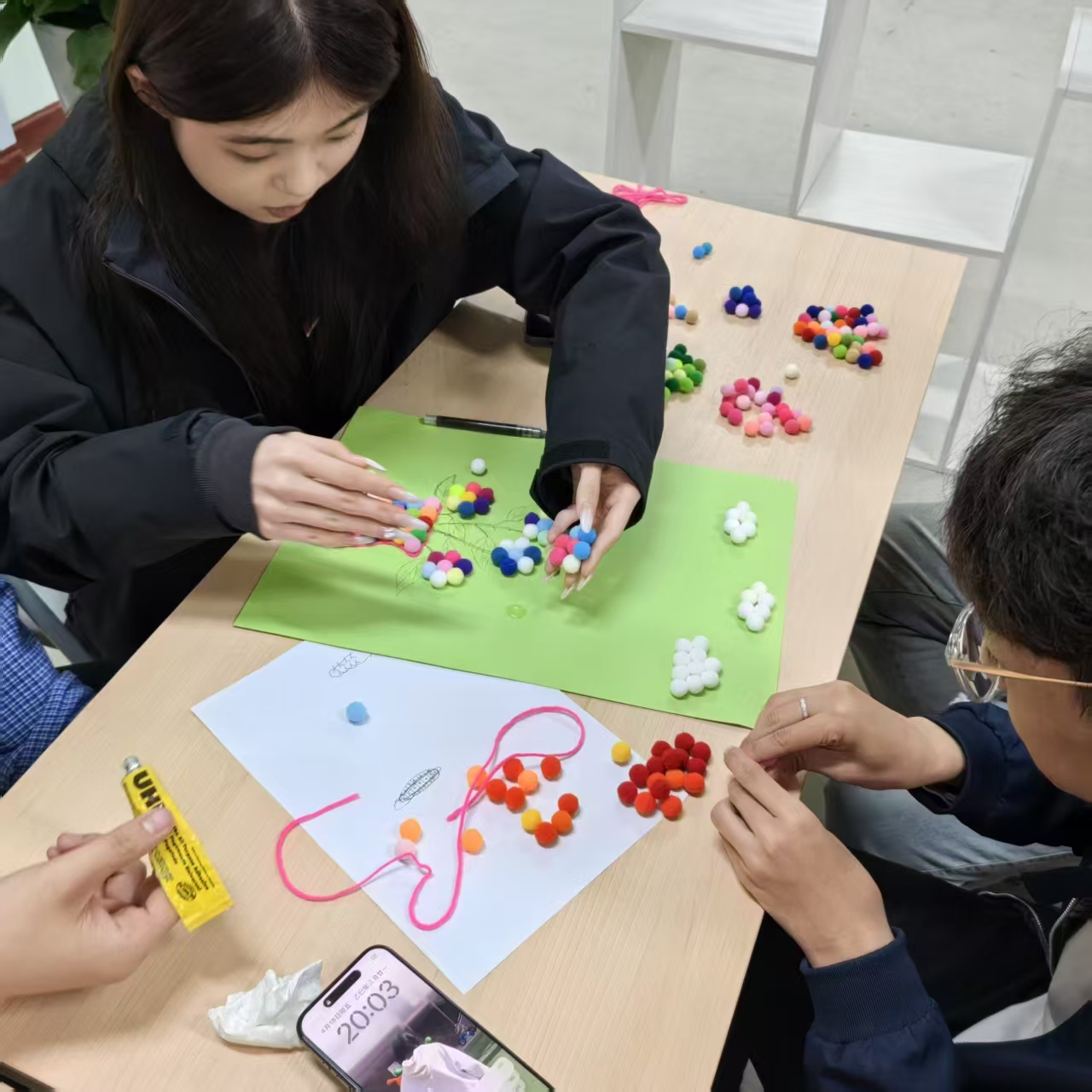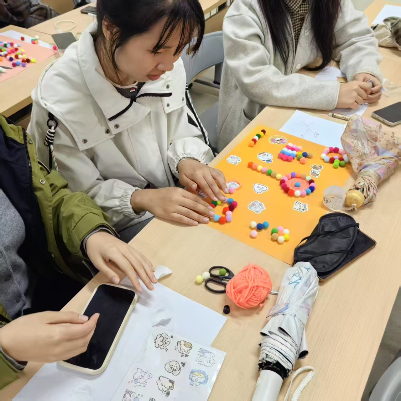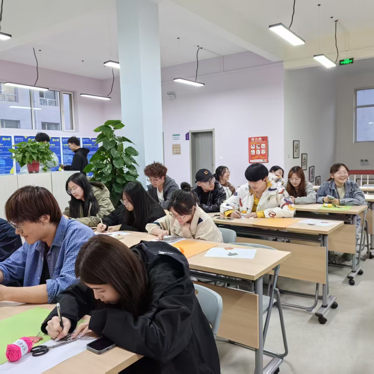 本次活动通过趣味游戏和艺术创作相结合的形式,为同学们提供了一个放松身心、发挥创意的平台。活动分为两个部分,首先是“你画我猜”,参与者们通过绘画传递信息,考验默契与想象力。游戏过程中,同学们或认真构思,或会心一笑,现场气氛轻松活跃。第二部分是创意画部分,现场还准备了毛球、毛线贴纸等丰富材料供同学们用于创作。这些五颜六色的绘画制作材料,极大地激发了同学们的创作热情。大家将不同质感的材料拼贴在卡纸上,创作出各具特色的艺术作品。此次活动让同学们在创作过程中释放压力,感受艺术带来的心灵治愈。